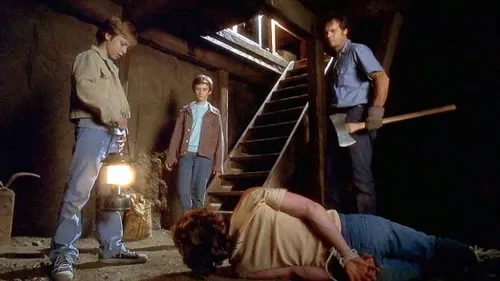 Fenton tries to get his younger brother to run away with him, but Adam is a true believer. He’s seen the demons too when Dad touches them. Or at least he thinks he has. It’s never entirely clear if Adam genuinely experiences these visions or if he’s just so desperate to please his father that he’s convinced himself. When Fenton finally works up the courage to go to the sheriff, it backfires spectacularly. The sheriff comes to their house, checks the cellar, finds nothing suspicious, and is about to leave when Dad hits him with the axe on the stairs. The sheriff tumbles back down, still alive. This is different from the “demons”—Dad is devastated. There’s blood everywhere. He’s never killed a person before, only demons. And it’s all Fenton’s fault.