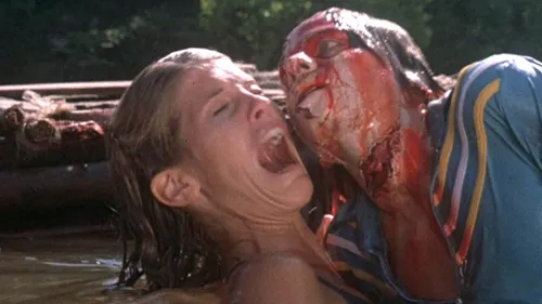 When the killing finally starts, it’s a mixed bag. Tom Savini handled the special effects, and he famously chose this film over Friday the 13th Part 2 because he thought Jason surviving after drowning as a child was illogical. Which is a weird hill to die on when you’re making slasher movies, but okay. The infamous raft massacre scene where Cropsey somehow hides in a canoe, stands up without tipping it over, and slaughters five kids while wearing a full trench coat and hat was graphic enough to land the film on the UK’s video nasties list.